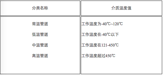 根據管道工作溫度不同分為低溫、常溫、中溫和高溫管道,其劃分標準見(jiàn)表1-1-8。